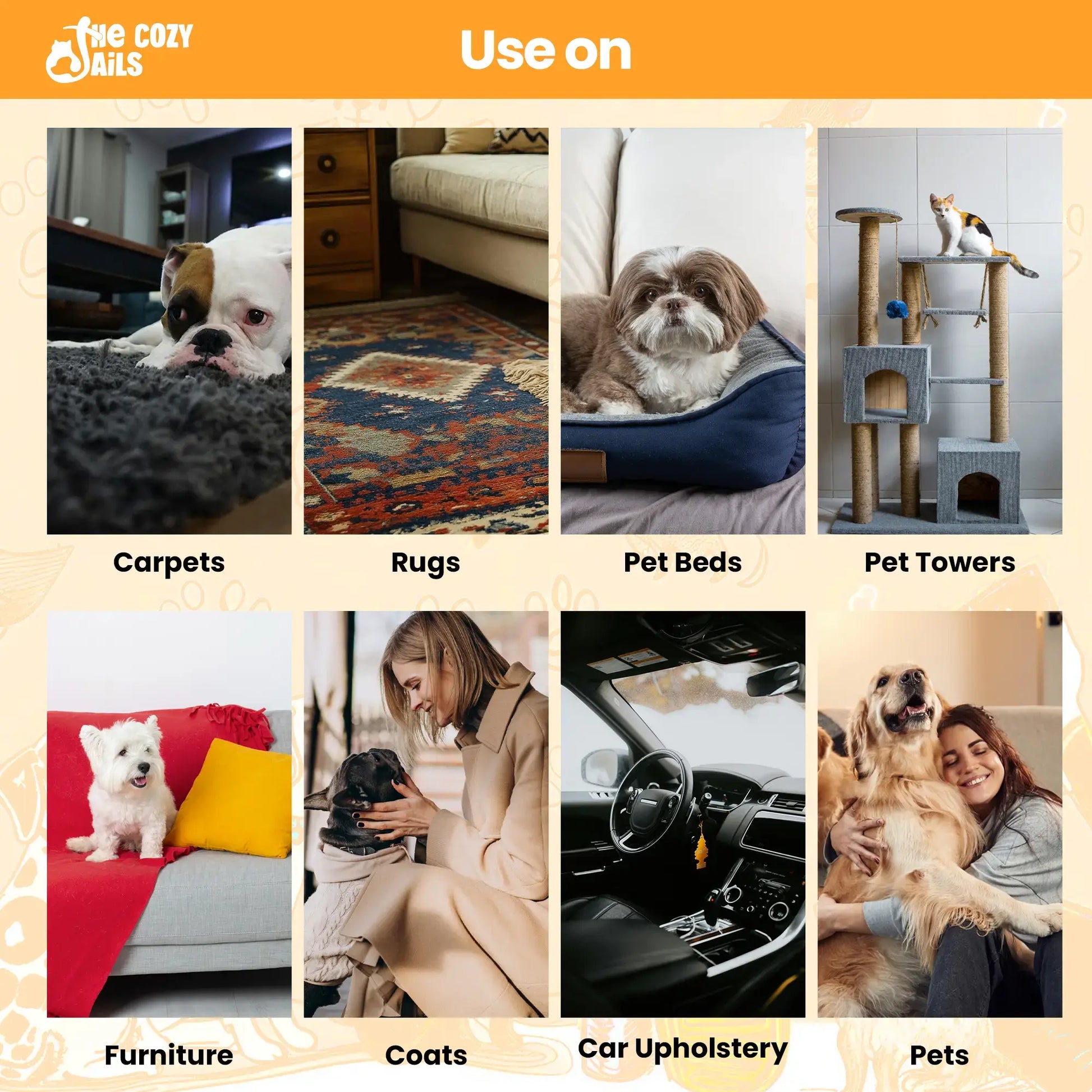 It is ideal for soft surfaces like couches, bedding, car seats, and clothes. It’s not designed for hard floors or smooth tabletops.