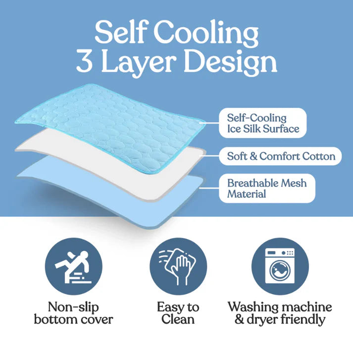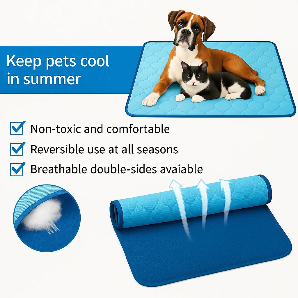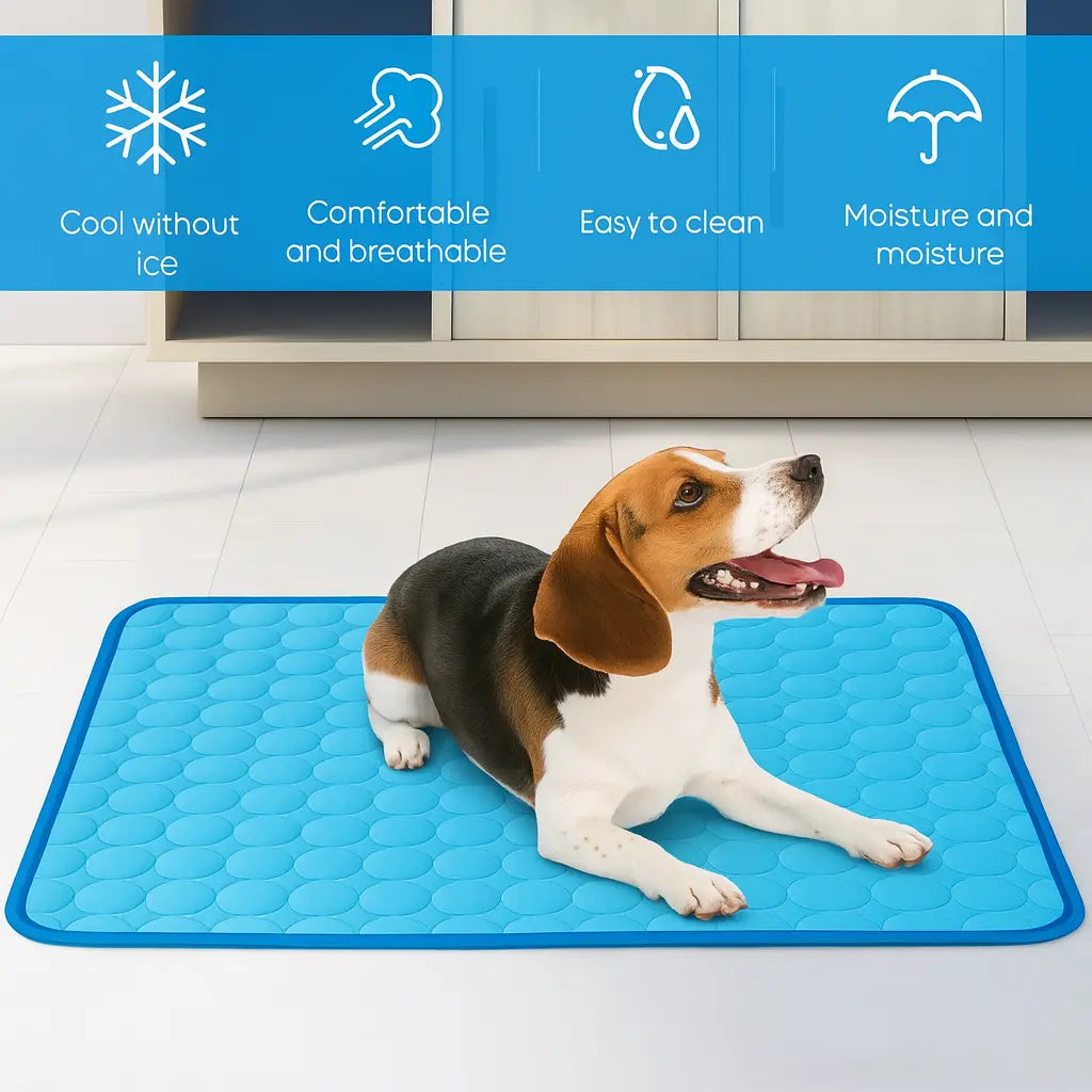 Keep your pet cool and comfortable on hot days — no water, no electricity, just smart cooling fabric that works on its own.